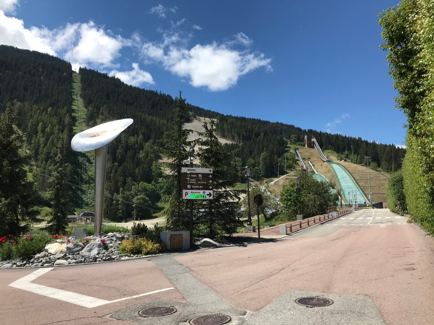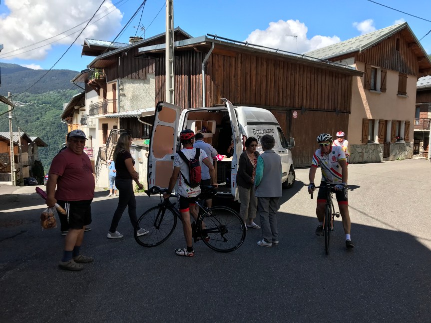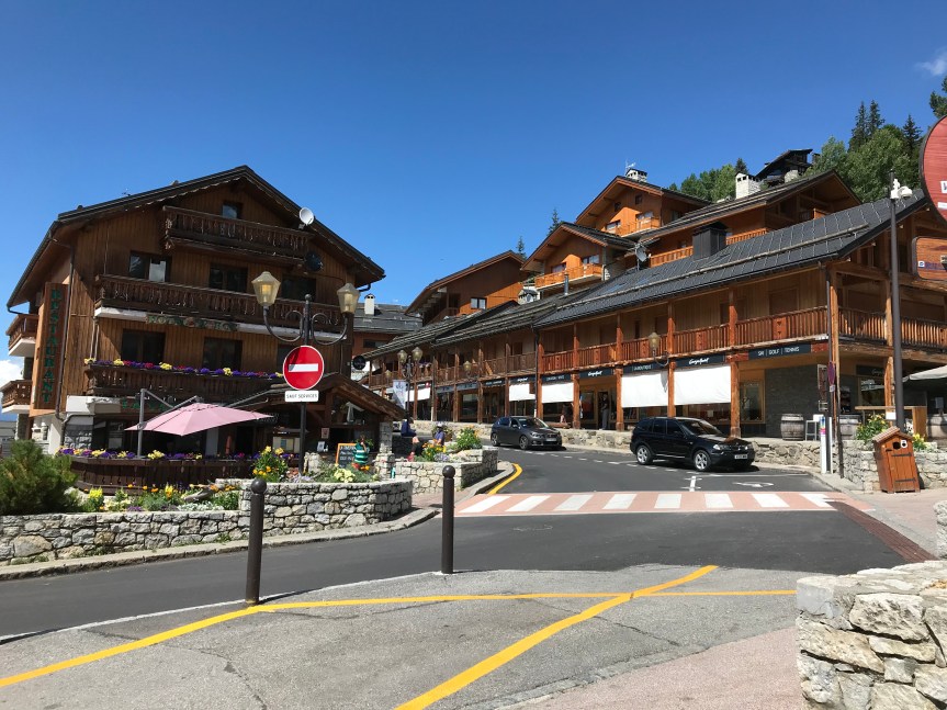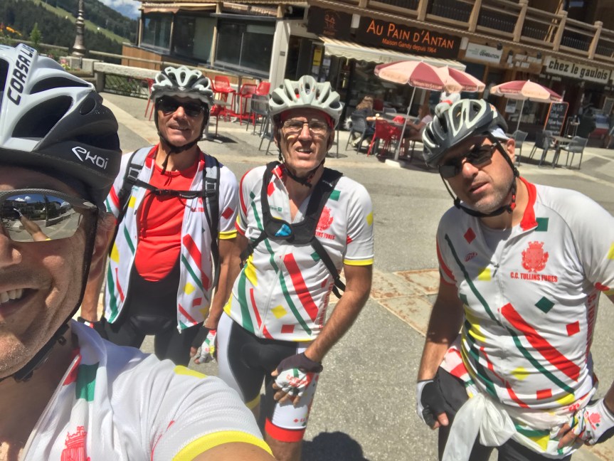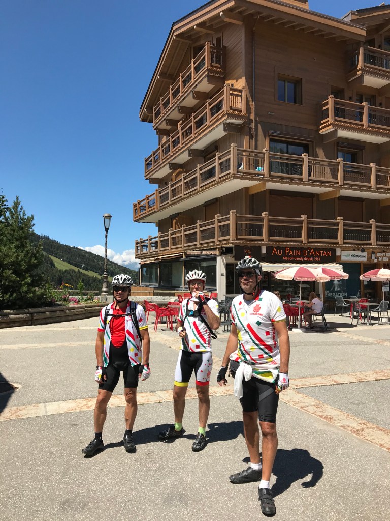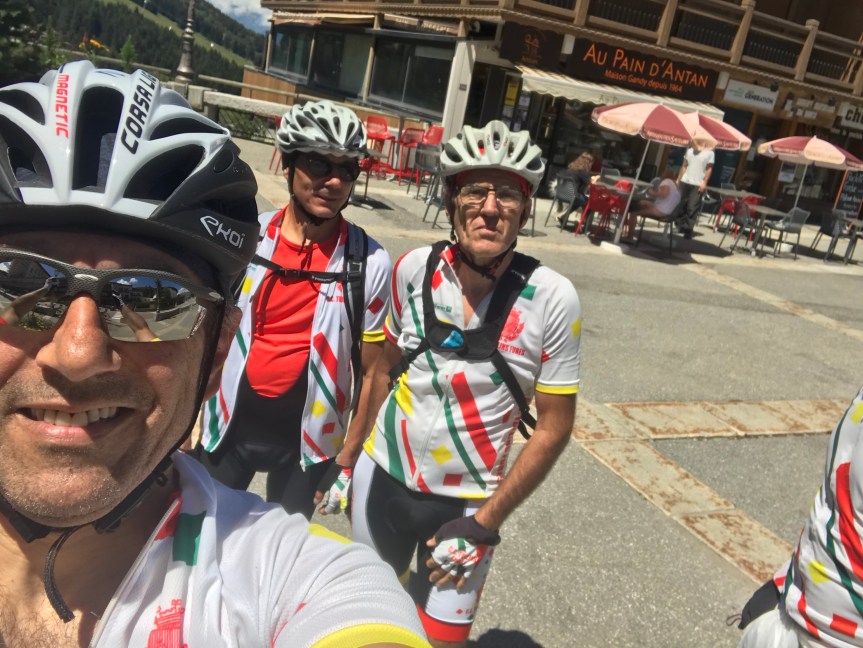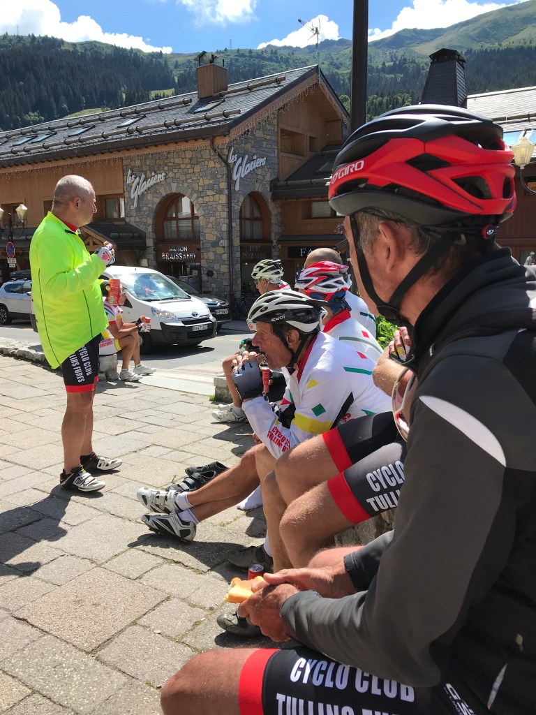 Apres une pause bien méritée en haut de ce col qui culmine à 2304 m d’altitude, nous nous laissons glisser sur Méribel, lieu de l’arrêt de la mi-journée, ou nous pourrons recharger « les batteries » ( sauf pour Alain , il lui reste encore des barres…😉) grâce à un petit casse-croûte et une boisson, pris sous les chauds rayons du soleil.