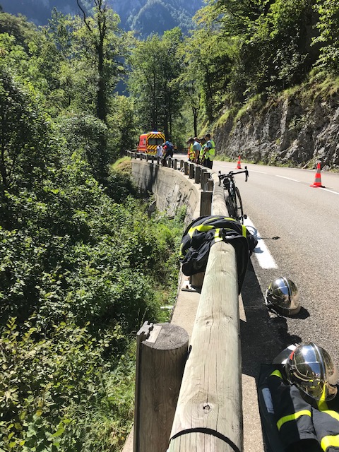 Mais rapidement c’est un camionneur qui s’arrête à notre auteur et nous signale que notre collègue a chuté et se trouve dans le ravin ! … sans tarder nous remontons sur les lieux de l’accident avec cette inquiétude qui ne nous lâchera pas jusqu’au diagnostic de son état et de ses blessures …