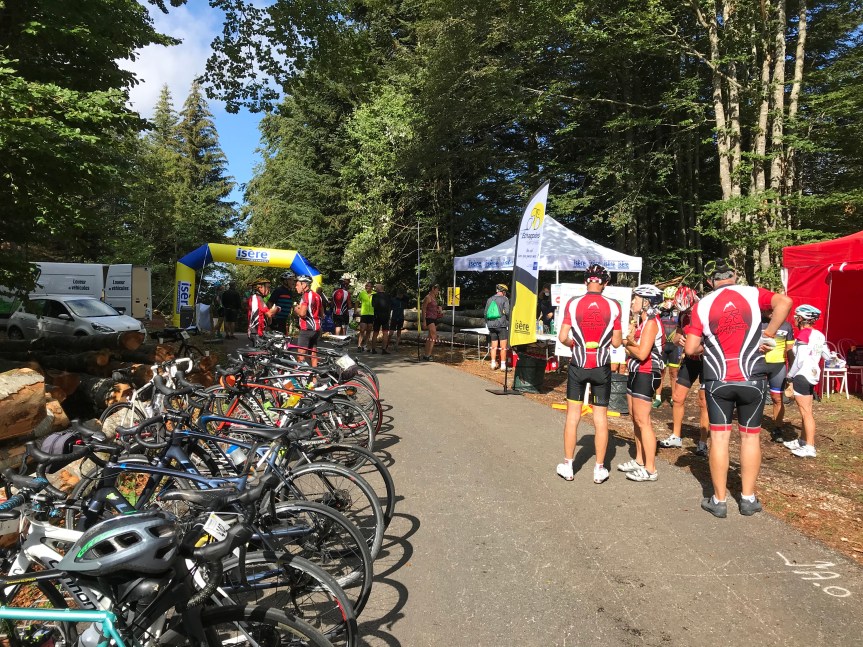 Originalité de la Rando , le chronométrage du parcours entre St Pierre de Cherennes et le sommet du col du Mont noir. Pour se faire, au départ nous sommes doté d un carton d’ identification à fixer sur le guidon du vélo. Sur ce carton nous avons notre numéro de participant et aussi la puce de détection pour le chronométrage.